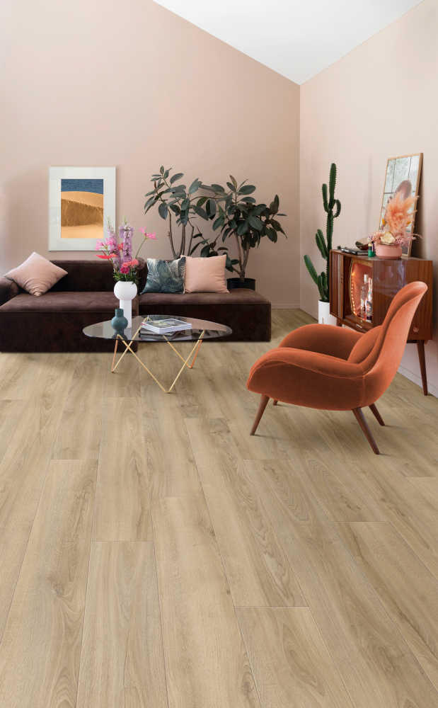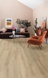 Podlaha so skutočným charakterom a šarmom Electo dub Texas s výraznými prasklinami a prirodzenou farbou dodajú každej miestnosti živú atmosféru. Hlboká textúra podlahy „embossed in register“ (EIR) zachytáva svetlo pre pozoruhodný, prírodný efekt dreva.